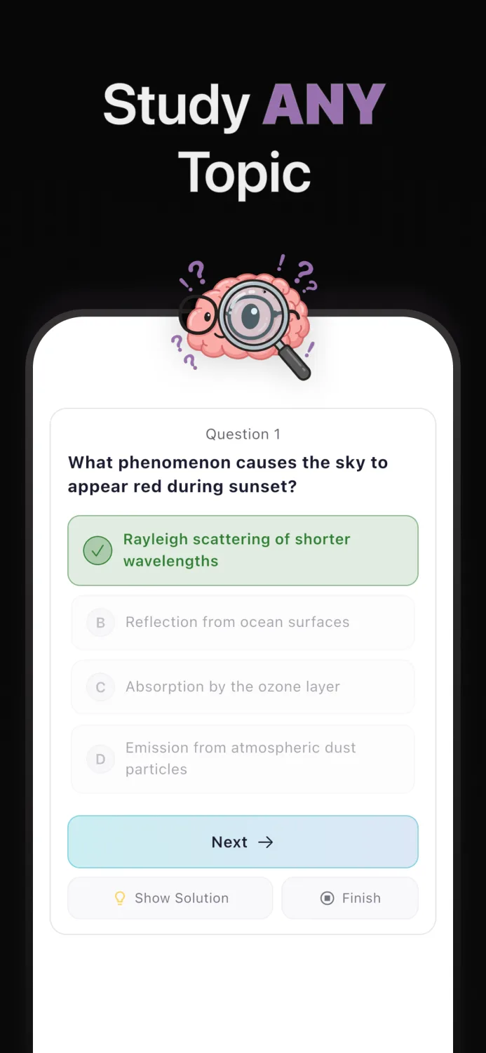 Pick any subject. Get adaptive questions in seconds. Actually retain what matters.